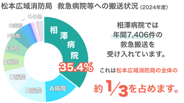 相澤病院は24時間365⽇の救急医療対応を医の原点として、地域住⺠の安⼼・安全を守ることを使命に、年間7,400台を超える(2024年度実績)救急⾞を受け⼊れています。これは松本地域の全搬送件数の約35%を占めていることになります。