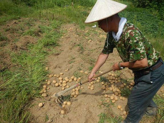 2013年より休耕地を開墾して、ジャガイモやサツマイモからスタートしました。農業はほとんどやった事がないため、はじめる時は周りの人から本当にできるのかと言われていましたが、草だらけの畑の開墾から始まり、島で農業をやっているお年寄りに色々教えて頂き、励まされながら、1年目・2年目とジャガイモを育てることができ、島の皆さんにも配る事が出来ました。皆さんも喜んで下さり、エーベと聞くと「ああ、じゃがいものね」と言われるようになりました。