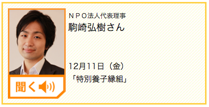 さて、このプロジェクト立ち上げに先だち、12/11(金)の朝、NHKラジオ第一「マイあさラジオ」の「今週のオピニオン」というコーナーにて、駒崎が「特別養子縁組」という制度について説明しました。