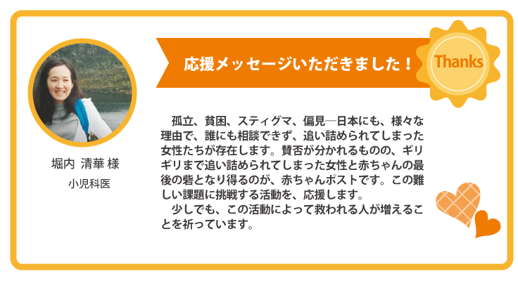 小児科医の堀内清華様からの応援メッセージをご紹介させていただきます。