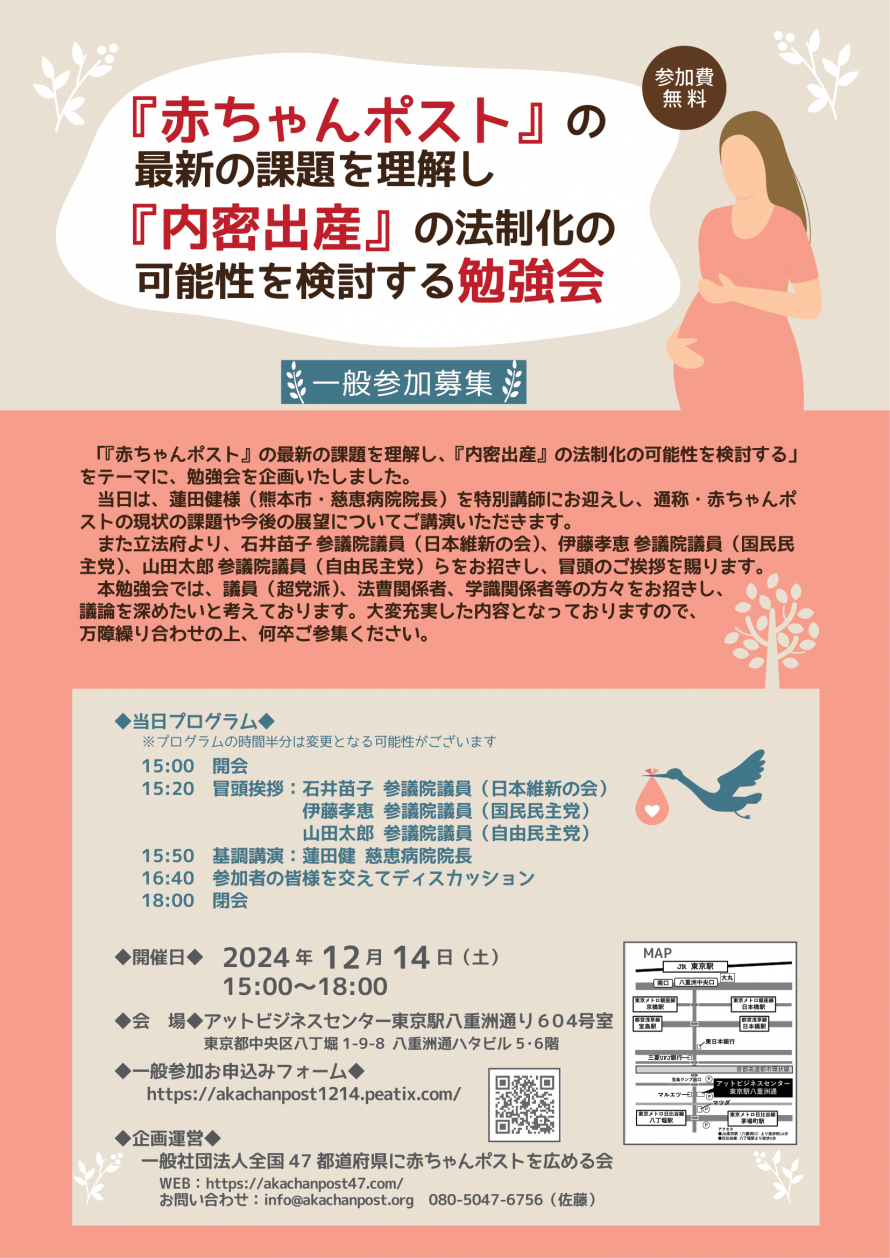 先着30名様・一般参加募集!「『赤ちゃんポスト』の最新の課題を理解し、『内密出産』の法制化の可能性を検討する」をテーマに、勉強会を企画いたしました。