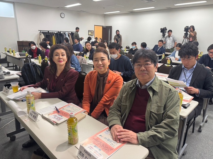 写真は左から、石井苗子 参議院議員(日本維新の会)、伊藤孝恵 参議院議員(国民民主党)、山田太郎 参議院議員秘書(自由民主党)