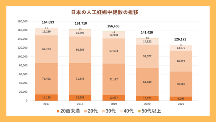 日本の人工妊娠中絶の件数は、年々低下しつつありますが、それでも2021年時点で、年間12万人を超えています。 中でも10代・20代が半数を占めています。