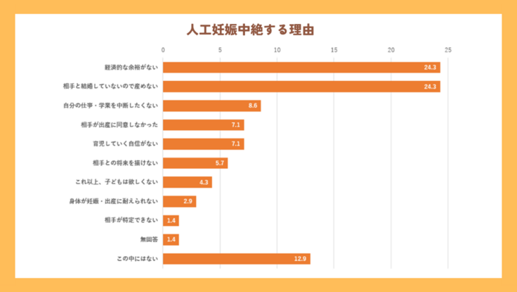 人工妊娠中絶の理由を見ると、「経済的な余裕がない」「相手の不同意」が、約半数を占めていることがわかります。それ以外にも、「仕事や学業を中断したくない」「育児していく自信がない」などの理由が挙げられています。