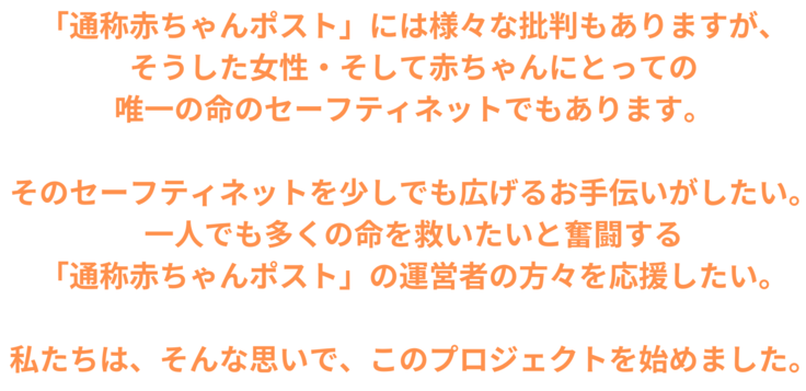 まもなく、東京で2つの医療機関が、第2・第3の赤ちゃんポストを立ち上げられるとのこと。私たちは、そうした新たな芽を後方支援できる仕組みを構築したいと心から願い、このプロジェクトを立ち上げました。