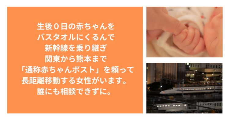 新幹線や公共交通機関を乗り継いで、東北や関東・中部地方から、生後間もない赤ちゃんを抱いた母親が、赤ちゃんをへその緒が付いた状態で、バスタオルにくるみ、熊本市まではるばるやってくるケースも少なくありません。母子ともに非常にハイリスクな状態で「通称・赤ちゃんポスト」を利用しているのです。