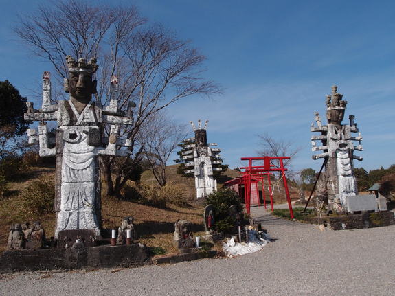 まず北に小丸川を渡った持田台地には、85基の古墳が散在する持田古墳群があります。昭和にはいり、持田古墳群の多くの古墳が盗掘の被害にあい、出土品の多くは県外へ流出していきました。その古墳の霊を鎮めようと、岩岡保吉という男が一人で彫り上げた約750体の石像が持田古墳の一角に立っています。「高鍋大師」です。