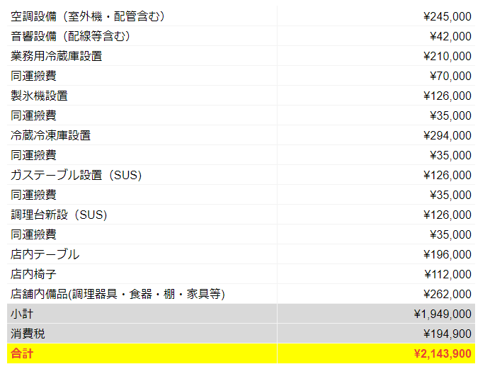 ▼空調赤坂おかげ必要設備・什器・備品 設備(室外機・配管含む) ¥245,000 音響設備(配線等含む) ¥42,000 業務用冷蔵庫設置 ¥210,000 同運搬費 ¥70,000 製氷機設置 ¥126,000 同運搬費 ¥35,000 冷蔵冷凍庫設置 ¥294,000 同運搬費 ¥35,000 ガステーブル設置(SUS) ¥126,000 同運搬費 ¥35,000 調理台新設(SUS) ¥126,000 同運搬費 ¥35,000 店内テーブル ¥196,000 店内椅子 ¥112,000 店舗内備品(調理器具・食器・棚・家具等) ¥262,000 小計 ¥1,949,000 消費税 ¥194,900 合計 ¥2,143,900
