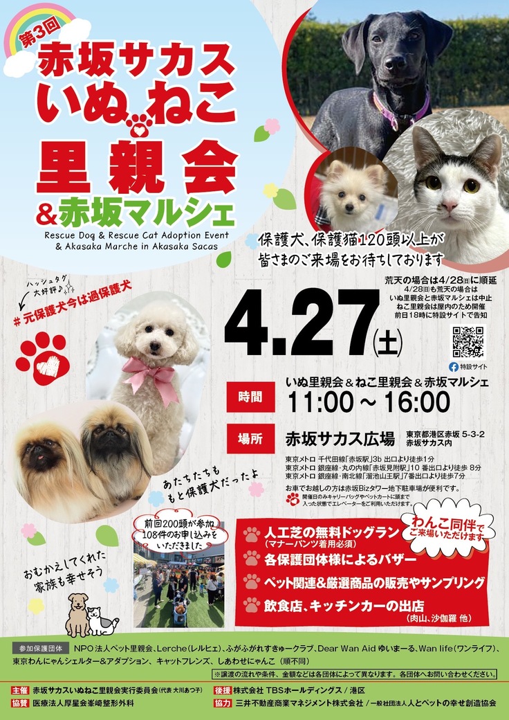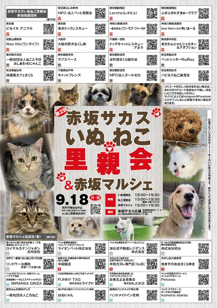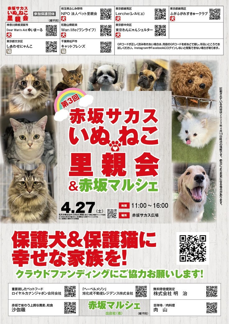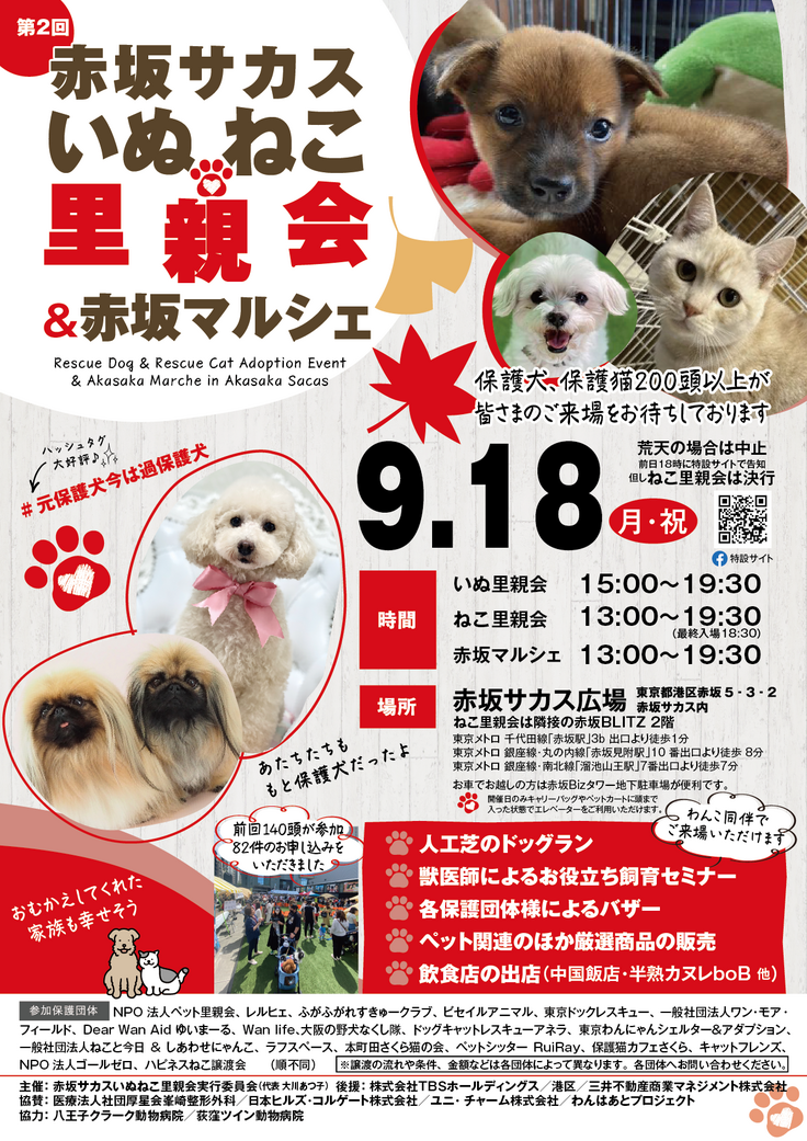 複数の保護犬、保護猫の保護団体様にご参加いただき譲渡会を東京都港区にて行われる「赤坂サカスいぬねこ里親会」主催しております。昨年9月18日に開催された赤坂サカスいぬねこ里親会では、、保護犬、保護猫200頭、来場者3,500人、そして108頭の里親希望のお申込みがあり、その後行われた保護団体様の譲渡会でも、赤坂での出会いがきっかけで何十頭も里親さんが決まりました。これからもずっと譲渡会を続けていきますので、応援よろしくお願いいたします。