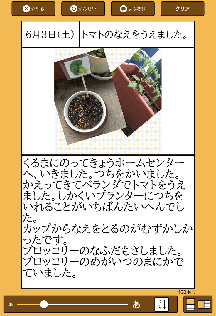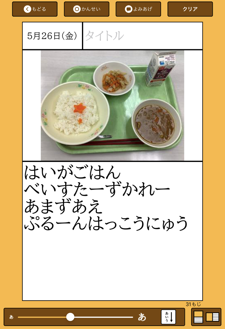 - 読み上げボタン:書いた文章を合成音声で読み上げるボタン。書いた内容を耳で確認できます。読み上げられることで達成感も得られるようで、子ども達に人気の機能です。