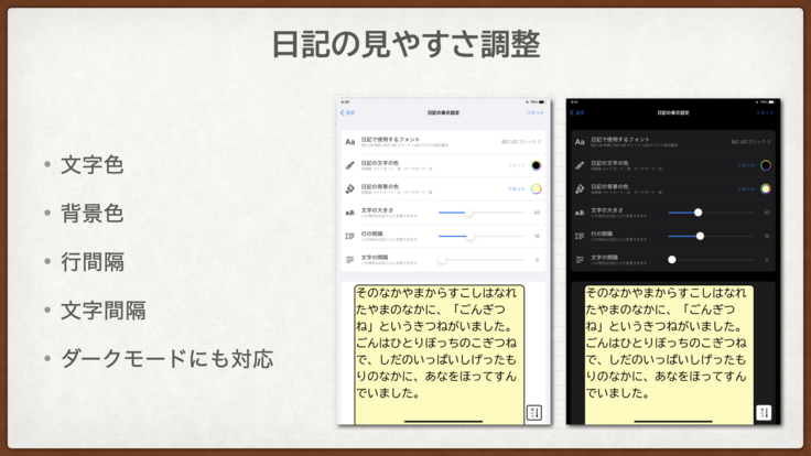 上の画像は、日記の見やすさ調整を画面のスクリーンショットです。