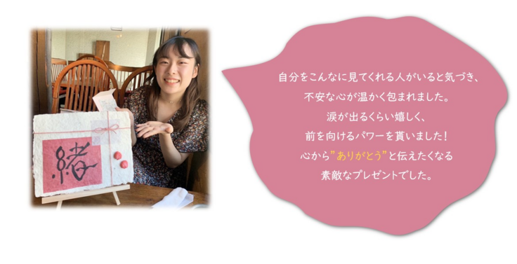私の原動力は、手紙書道を贈った方々からの言葉です。涙を流しながら、「一生モノの宝物」「愛を感じるプレゼント」「出逢えてよかった」と言ってくれる言葉が、私の背中を押してくれます。