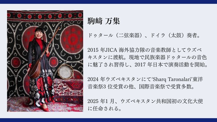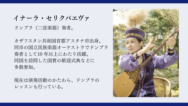 本研究公演は、中央アジアの歴史の中で生み出された音楽、とくにウズベキスタンとカザフスタンの伝統音楽を中心に紹介します。伝統音楽の演奏とともに、シルクロードをつうじて各地に広がった楽器の解説も交えながら、中央アジアの伝統的な音楽を広く知っていただくとともに、特別展へのいっそうの理解を深める機会となれば幸いです。