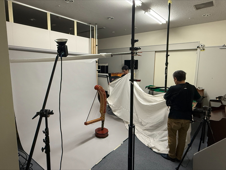 先日、特別展の図録に掲載するため展示資料の写真撮影を行いましたので、撮影の舞台裏を少しご紹介いたします。今回の撮影には展示資料をお借りする、浜松市楽器博物館さま、浜名梱包輸送シルクロードミュージアムさまにご協力いただきました。