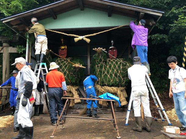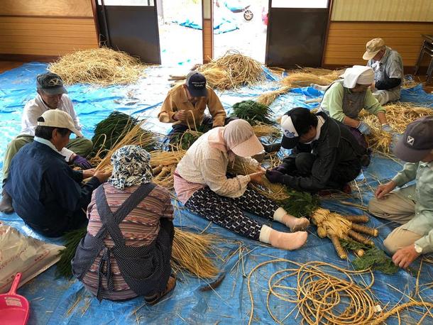 午前8時、小雨がぱらつく中、作り替えの行事が始まった。男女33名が集落の中心部にある公民館とニンニョサマを祀るお堂の2カ所に分かれて作業にあたっていた。