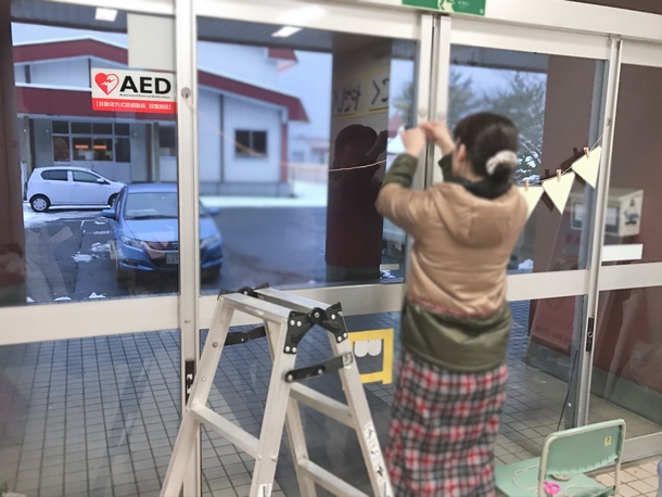 雪が降り外と変わらない校舎内、暖房器具がまだついておらず、防寒具を着てスタッフ一同リユース品のサイズ分けを、床貼りはコストを少しでも下げてと思い、コツコツと自分たちで手作業しております。
