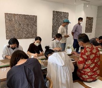 ワィエダ兄弟からのレクチャーを受けたながら、彼らが持って来てくれる牛糞の紙キャンバスに自分の一枚を書きます。