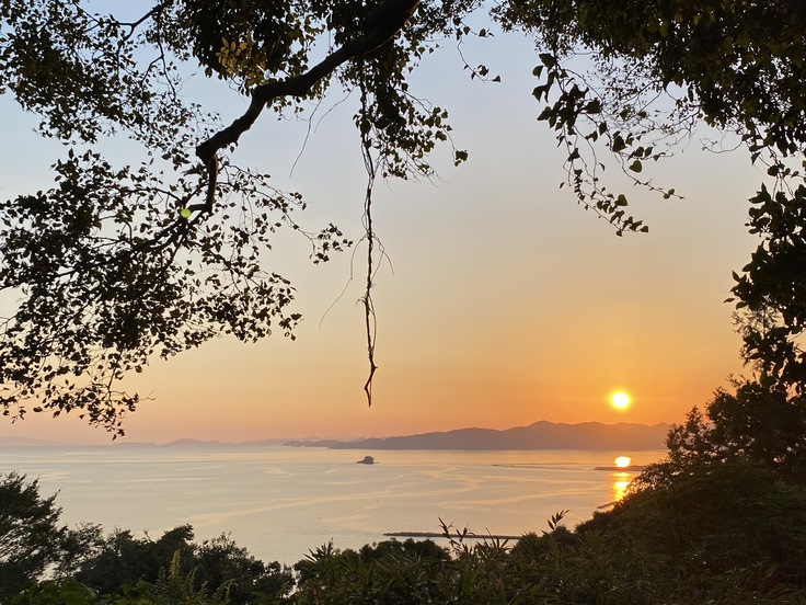 ここに座って、灯台と夕陽と作品を楽しめたらなーと。