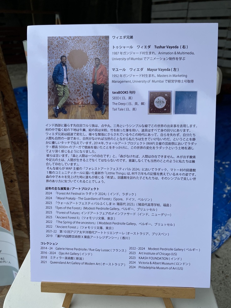 トークセッションでは、彼らが参加したインド・ラダックでのフォレストアートフェスティバルの様子や彼らの村・ガンジャード村での生活の様子、そしてワルリ画の歴史と現在などを映像を見ながらマユールが解説。単なる絵、アートではなく、その背景にあるワルリ族が連綿とつないできた世界観と、それが持続的な世界を願う上でいかに大切なことかということが語られました。