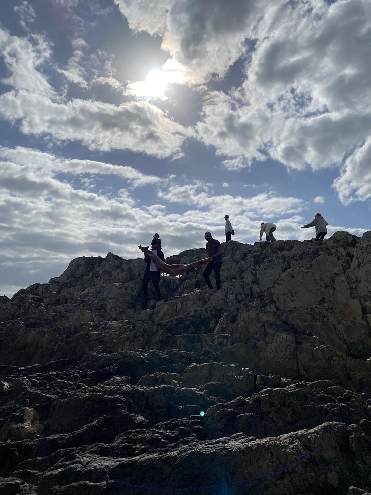 この岩、激しくギザギザで足元めちゃくちゃ悪く、3メートル弱の重い流木を持って上がるのはさすがに危険だろう!と声をあげる私たち。