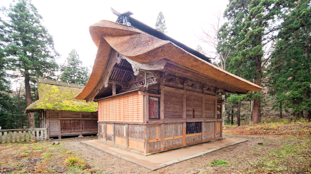 1メートルもあろうかと思われる茅葺屋根が重厚さを際立させ、神社の最奥に建っています。