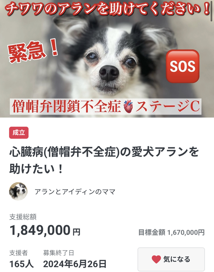 温かいご支援本当にありがとうございます。全額、アランの治療費に使わせて頂きます。心からの感謝のメールと、その後のアランの経過観察をこちらの活動報告にてお伝えいたします。