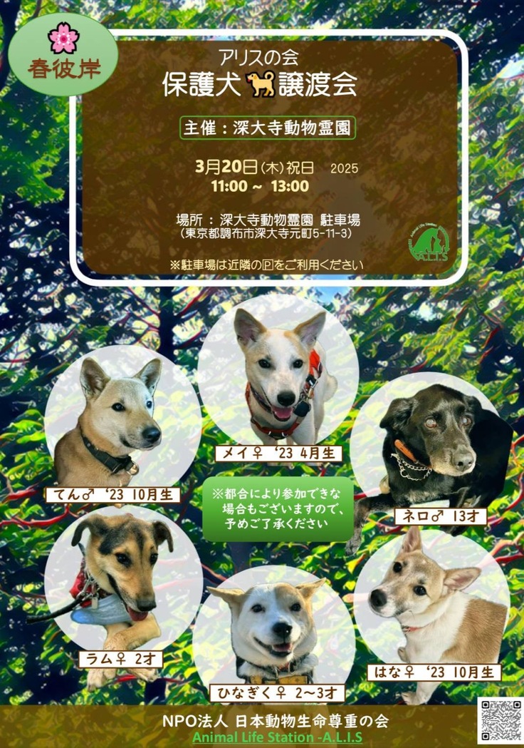 3月20日に調布市の深大寺動物霊園様の駐車場をお借りして、譲渡会を行います。