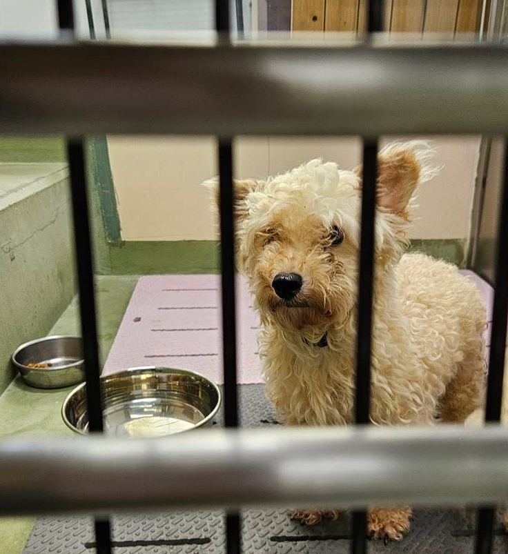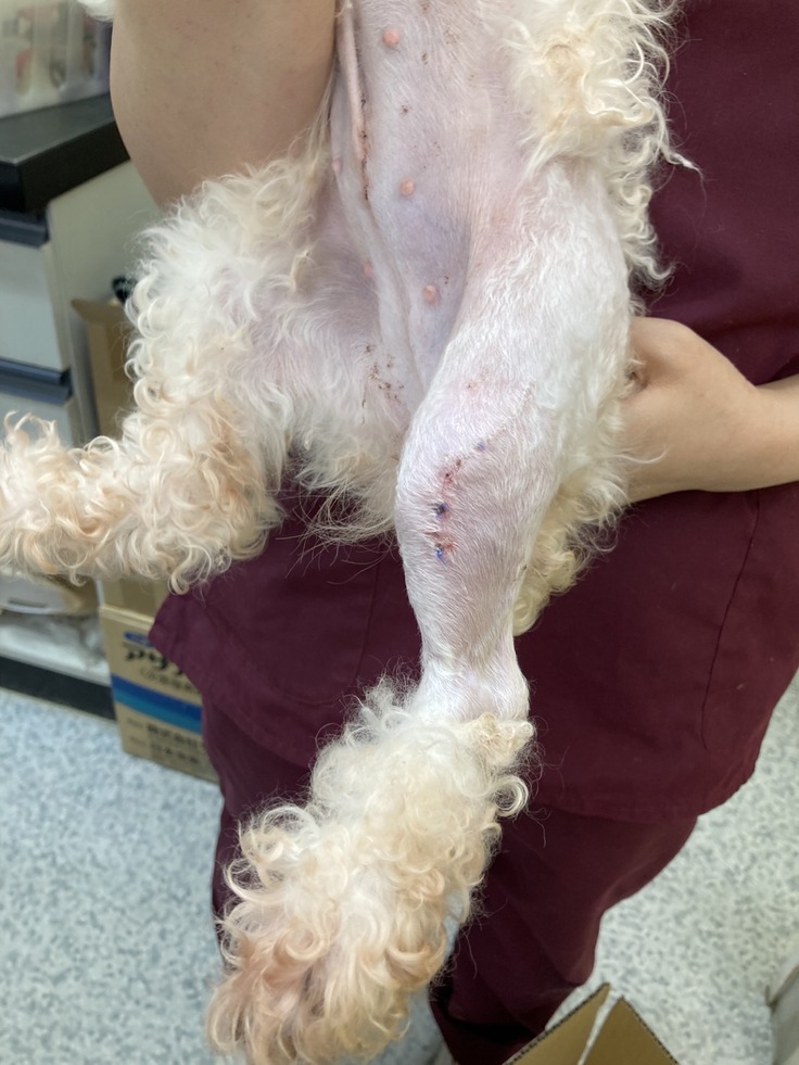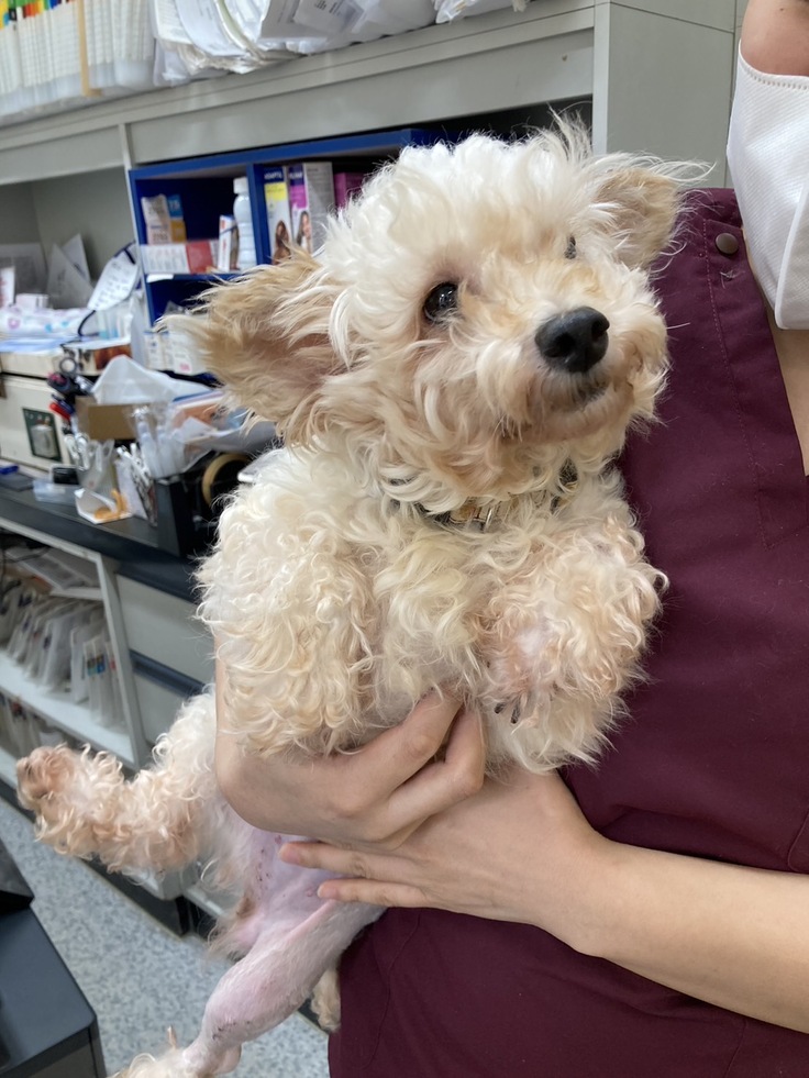 レスキュー後の全身の検査で、左後ろ脚に膝蓋骨骨折と靱帯断裂が判明したトイプーmixのみかのご報告です。