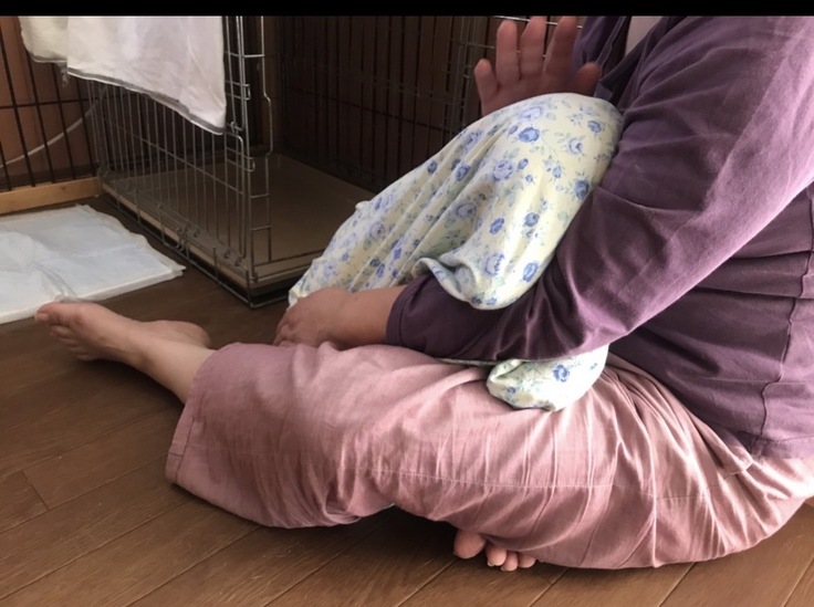 噛まれないように頭にタオルを被せてからトイレシートを中に敷くと、そこでトイレをするが、身体がオシッコやウンチで汚れてしまい、そのたびにまたタオルを被せて身体を拭く。