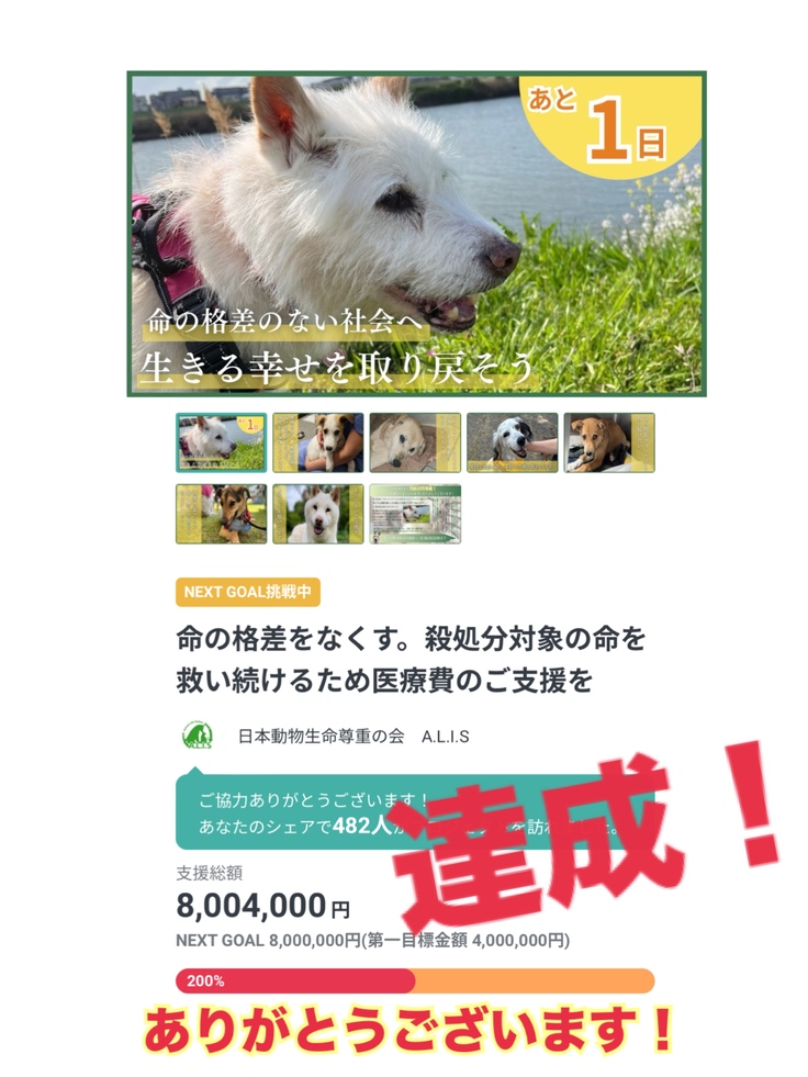 このクラウドファンディングは、最終日である8月30日(金) 23時の最後の瞬間まで、引き続きご支援の募集を継続します。第二目標として掲げていた800万円を超えていただいたご支援は、新たな命のレスキュー費用や医療費、フード代など、保護活動に必要な資金へ充てさせていただきます。
