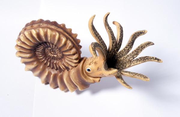 この種類はドイツのジュラ紀を代表する化石のひとつであり,本種のレプリカ模型(写真下)が市販されています.軟体部はともかく,殻の特徴は非常に正確に再現されています.日本でも手に入るのでお持ちの方も多いと思いますが,実在する種類の精密な“フィギュア”だったことはご存知でしたか?