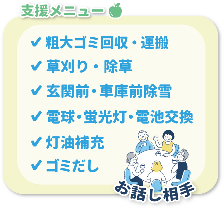 プロジェクト詳細に入る前に、高齢者生活支援を行う『 アップル支援隊 』の活動にもふれておきたく思います。(名前の由来は… 町の特産 りんごです。)