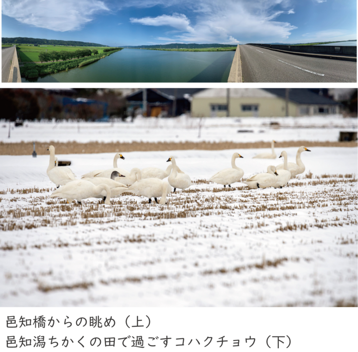 羽咋市中心部から北東約6㎞に、鹿島路町はあります。眉丈山系(びじょうさんけい)のパノラミックな景観と、例年1000羽超える白鳥や渡り鳥たちが飛来する邑知潟(おうちがた)が印象的な、静かで美しい町です。
