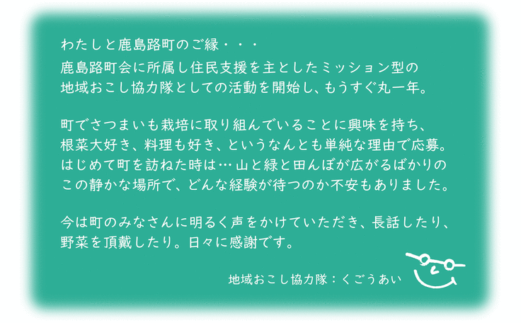 はじめまして。鹿島路町地域おこし協力隊のくごうあいと申します。