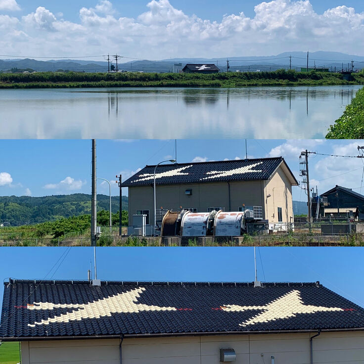 鹿島路町近くのかわいいビューポイント・ 屋根瓦に白鳥がデザインされた公共の建物