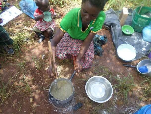 おかゆブレンド(メイズの粉に塩、砂糖とスピルリナを混ぜたもので、お湯入れて混ぜるだけでおかゆとして食べられるもので、主に幼児用)ね。私たちは今までメイズの粉に、栄養価の高いと言われるグランナッツやキャッサバをパウダー状にしたものを混ぜておかゆを作っていたんだけど、それと同じ要領で作れるからすごく使いやすいの。今はスピルリナとグランナッツ、キャッサバを順々におかゆに入れてあげているのよ。