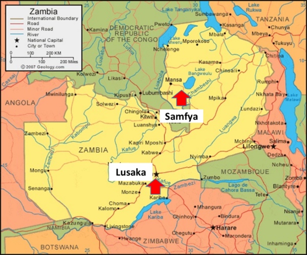 Luapula州Samfya郡は、首都Lusakaよりバスで11時間くらいかる800kmほど北にあり、Bangweulu湖という巨大な湖のほとりにある漁業の盛んな町です。Kabanga村はその町中から程近いところに位置しています。