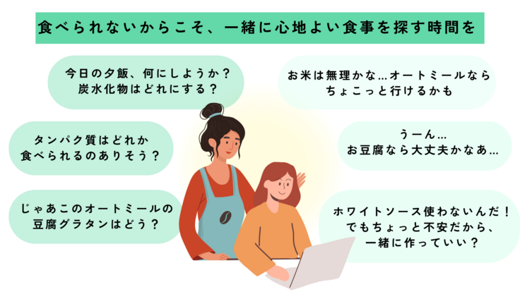 その現状を変えたいと、“親子で+パートナーと共に検索し、会話をしながら、心地よく食べられる食事を見つけるレシピページ“を立ち上げます。