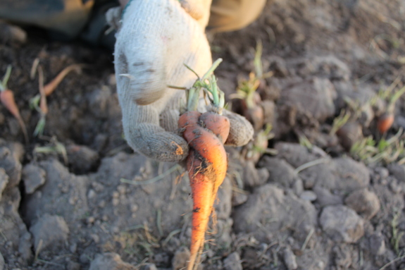 (ねじれたにんじん。土壌が固いため変形した野菜が多く見られます)