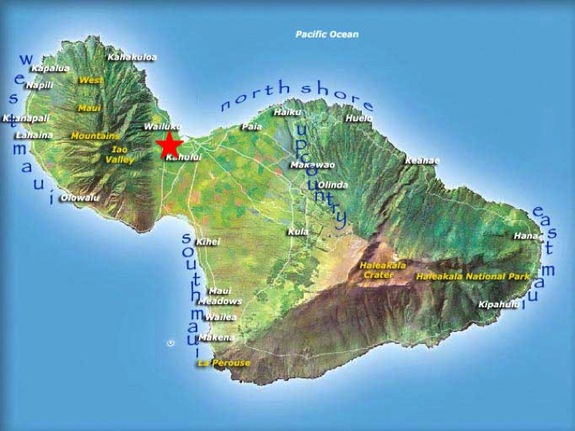 (マウイ島の地図。赤星がhappy valleyの位置)