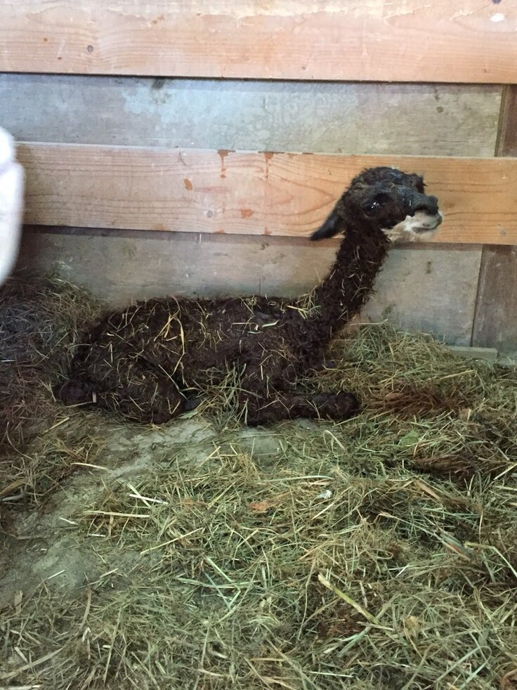 アルパカは大抵午前中に生まれると言われていますが、チョコさんが生まれてきたのは夕方。そして、大抵生後1時間前後で立ち上がるのですが、チョコさんは、なんと生後20分で立ち上がると同時に歩いていました。