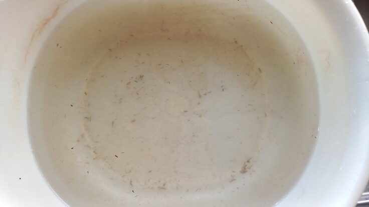水気を切って、最初に小分けした分ずつ、きれいなぬるま湯に入れ、繊維とは逆、横方向に広げるようにすると、砂やら草片やらがサラサラと落ちてきます。