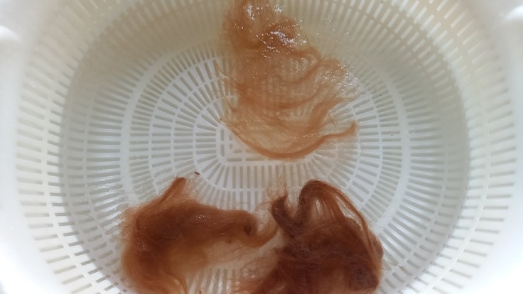 さて、だいたい50gを目の粗い洗濯ネットに入れ、洗浄液に入れます。私は13㍑の蓋つきバケツを使っています。使用する洗剤は、田舎でも買う事ができる「オシャレ着用洗剤」アクロンやエマールなど…。40度くらいかな?手を入れてちょうど良いお風呂ぐらいの温度に洗剤20ml溶かし入れ、その中に洗濯ネットごと1時間うるかします。