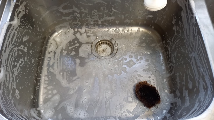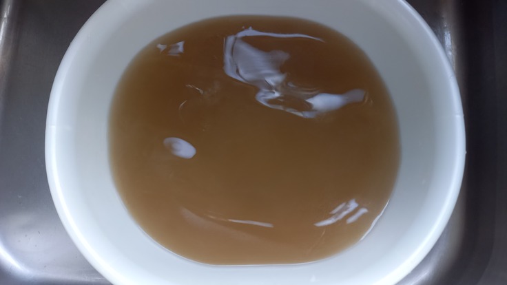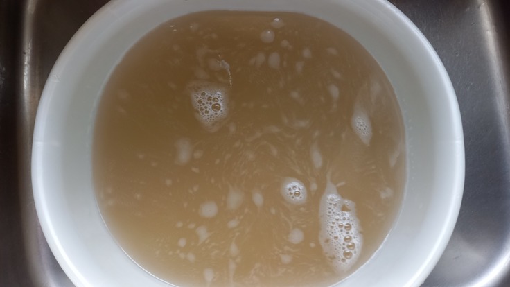 軽く水気を切ったら、同じ温度で、洗剤は半分の10mlで、さらに1時間うるかします。