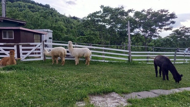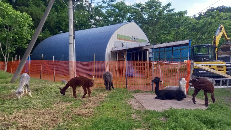 本当は16日の営業終了後からアルパカたちを外に出して慣れてもらう予定でしたが、生憎の雨。さすがに最初っから雨…っていうのも萎えるので、最後に「デコボコな床の畜舎」で過ごしてもらいました。