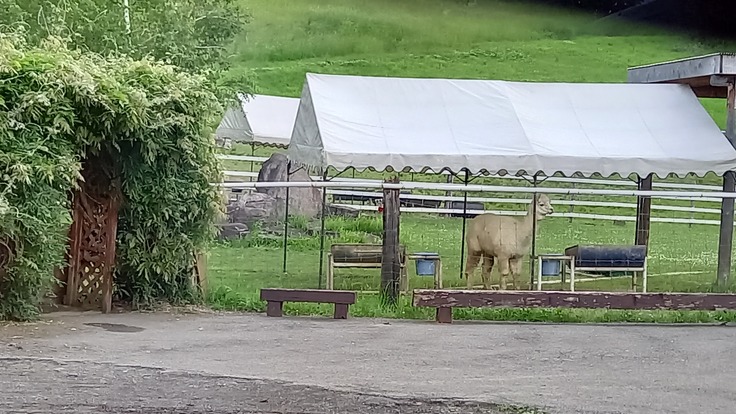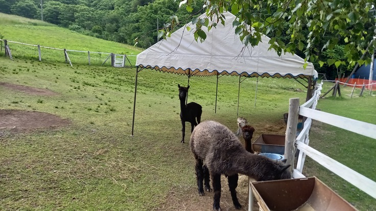 アルパカたちの近くで草抜きしてみたり、テントの中待ってみたりしたんだけど、みんな「フゥ~ン」「ん~」「フェ~ン」と大合唱で…💦