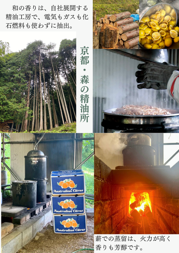 京都・森の精油所で蒸留した「柚子・ヒノキ・クロモジ」3種の京都産精油に加えて、ジャスミンやオレンジ・ラベンダーなど8種の精油をオリジナルブレンド。