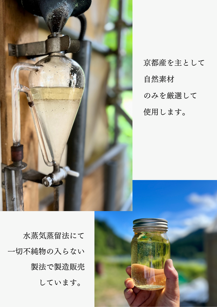 私は、そんな福知山市の限界集落にて京都産の素材を基本として様々な精油を水蒸気蒸留法にて抽出しています。
