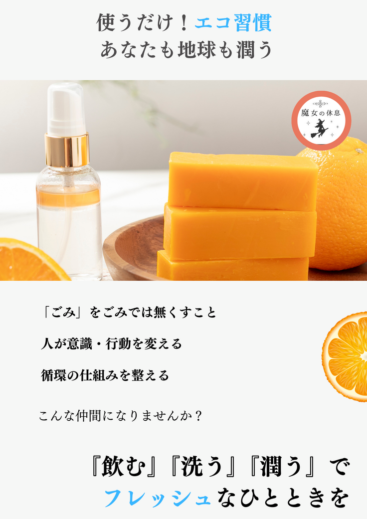 今回誕生したのが、「魔女の休息」です。「再利用することで廃棄物からこんな素晴らしいものが作れるんだ!「これってもったいないでしょ?アップサイクルって凄いんだよ」という事をテーマとして取り組んでいます。それに共感する全国の皆さんと、この取り組みを広げていきたいのです。そこで、今回、『オレンジミントで癒される無添加石鹸』と『2種の香りのボディ&ヘアオイルミスト』の3つの新商品を開発しました。