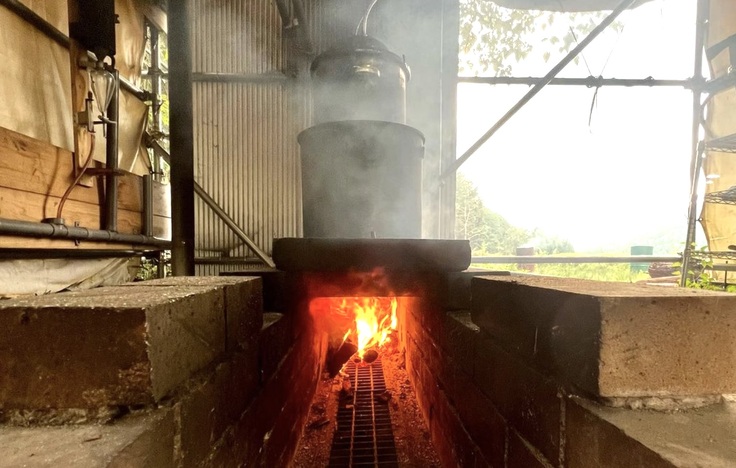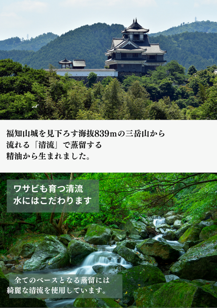 蒸留する水には、かってわさび畑で使用されていた山の清水を使用し蒸留する燃料も電気やガスを使用せずに『薪の高火力』にて蒸留し製品化しています。